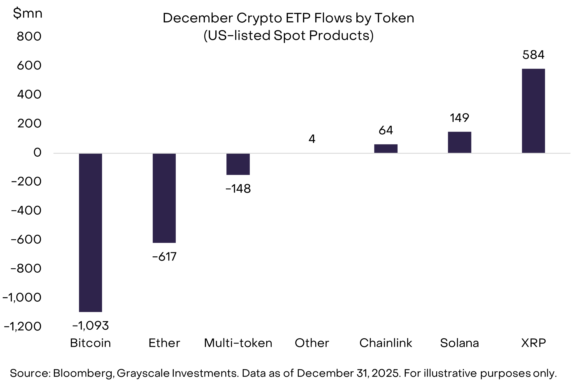 Net inflows into Bitcoin exchange-traded products (ETPs) were negative, possibly due to efforts by investors to realize capital losses before the end of the tax year (Exhibit 2). For example, U.S.-listed spot Bitcoin ETPs saw net outflows of about $1 billion in December. However, these same products experienced net inflows of almost $500 million on January 2, the first trading day of the new year.[1] The quick reversal suggests year-end flows may have had more to do with taxes than sustained shifts in demand. Although Bitcoin and Ether ETPs experienced net outflows during December, altcoin ETPs as a whole saw net inflows, led by spot XRP products (Exhibit 2). Despite sizable ETP inflows, the price of the XRP token underperformed, suggesting at least some of the inflow may have reflected in-kind creations rather than new purchases with fiat currency.
