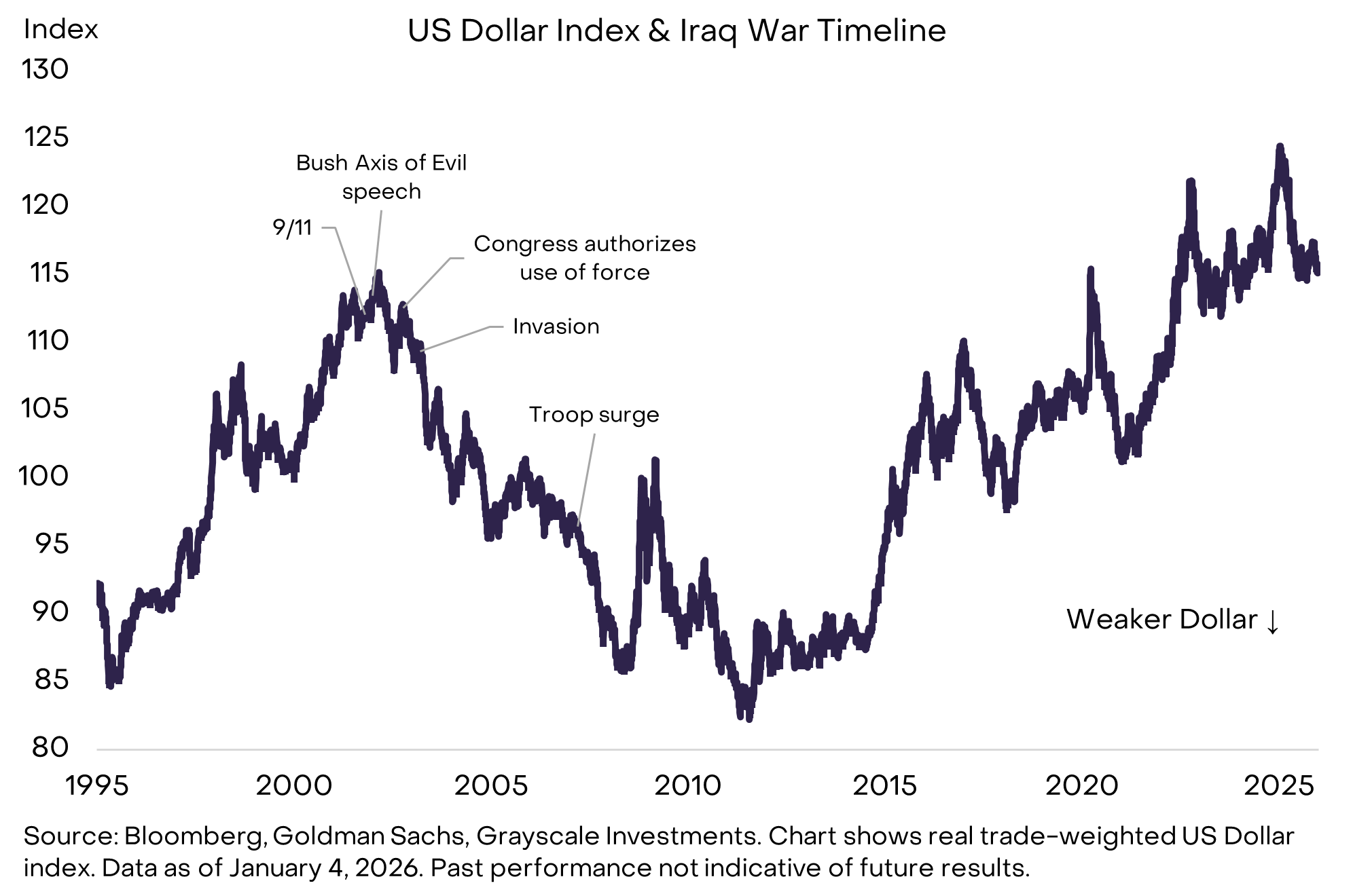Needless to say, the capture by the U.S. of Venezuelan President Nicolás Maduro has increased geopolitical uncertainty for global markets. It will take some time to determine the medium-term implications for the U.S. and global economies, but a prolonged conflict could have implications for U.S. deficits and debt, as well as international demand for the Dollar. While there are many important differences, the last major peak in the value of the Dollar occurred around the onset of the second Iraq war (Exhibit 6). Geopolitical factors including Russia’s war with Ukraine have been one factor driving demand for gold and other alternatives to the U.S. Dollar. If the U.S. conflict with Venezuela proves to have broader political implications, it could potentially drive further interest to alternative stores of value, including physical gold and silver and digital Bitcoin and Ether.