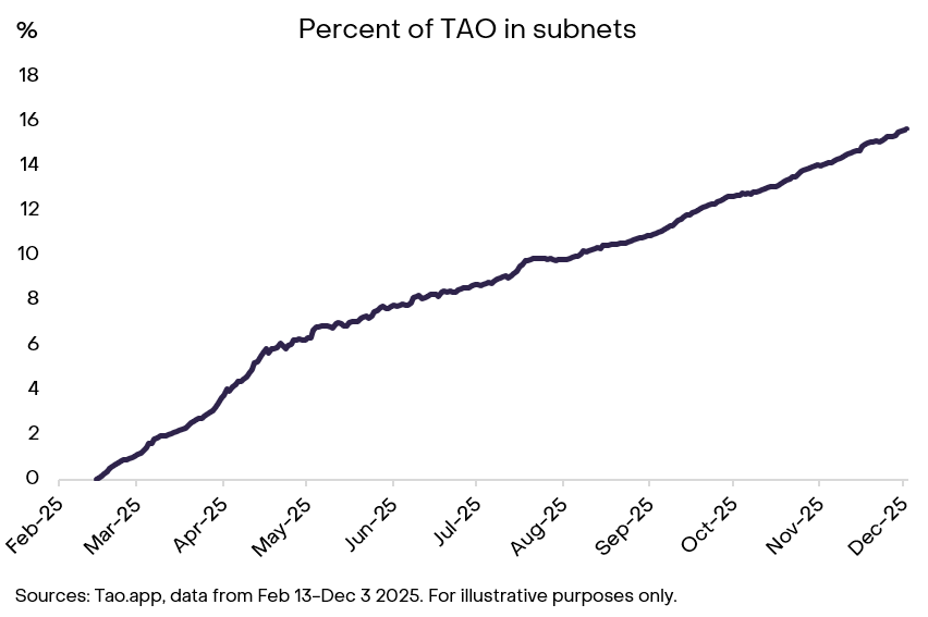 These developments — spanning network adoption and institutional access — have helped to drive growth across key metrics, including the number of active subnets, growth in number of accounts across the network, and a rise in the share of circulating TAO allocated to subnets (Exhibit 4).
