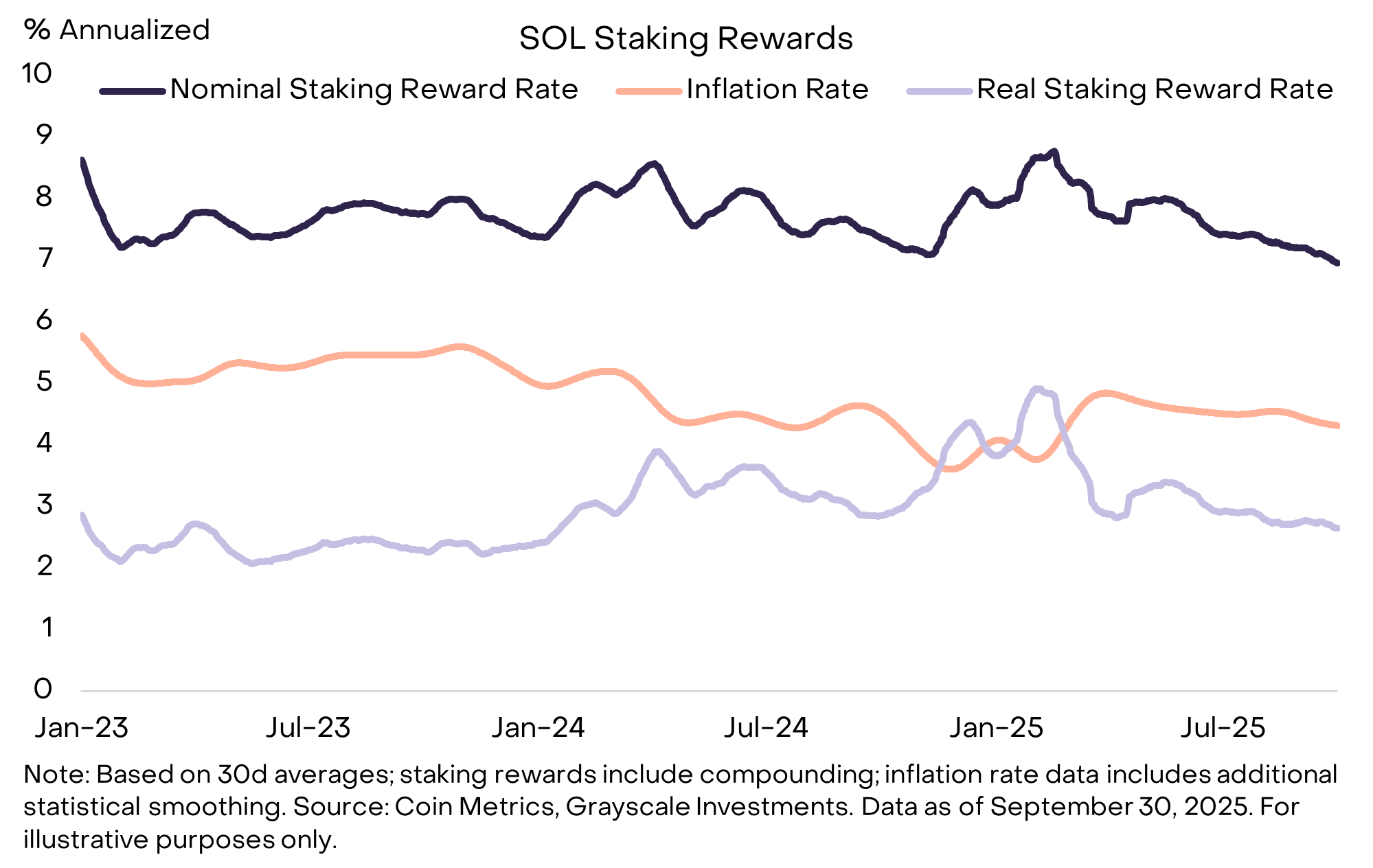 [23] Source: Coin Metrics, Grayscale Investments. For the 90 days ending September 30, 2025, the share of SOL staked averaged 68%.